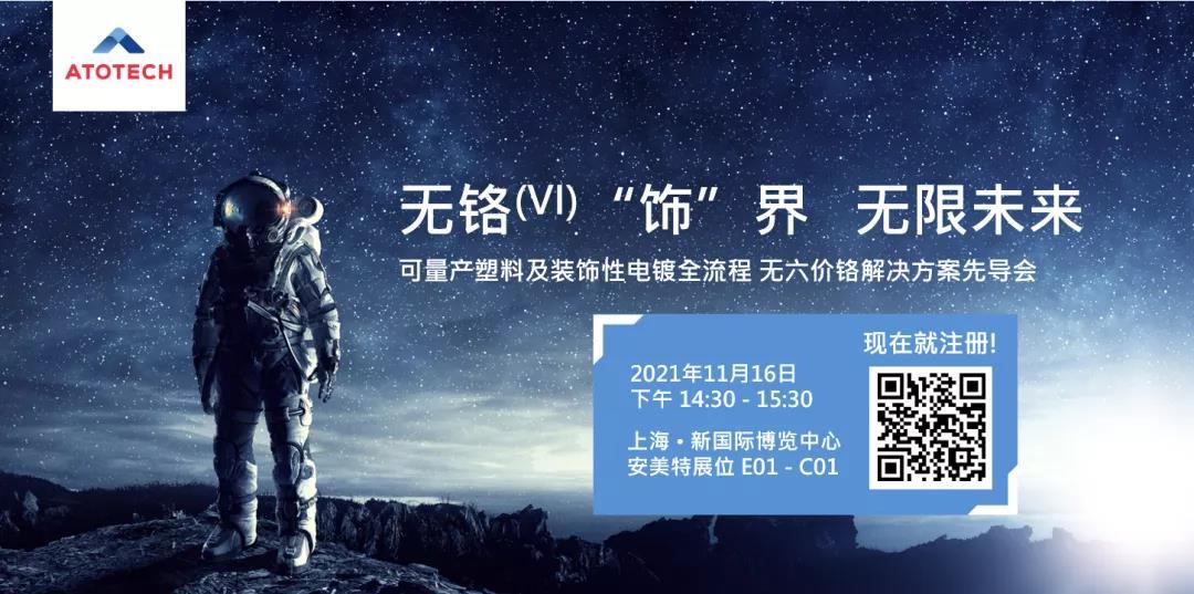 研讨會 | 無(wu)鉻(VI)“飾”界,無(wu)限未來!可(ke)量産塑料(liao)及裝飾性(xing)👯🏾♂️電鍍😘全流(liu)程😥無六價(jia)鉻解決方(fang)案先導會(hui)