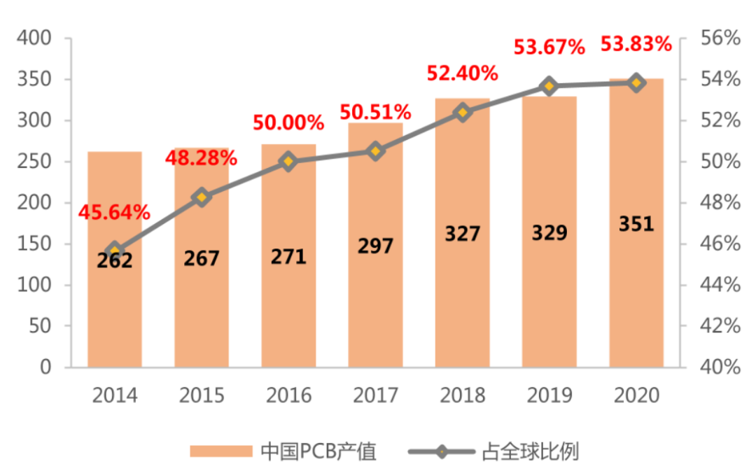 從2006年開(kai)始,中國(guo)的PCB産值(zhi)便超過(guo)了日本(ben)成爲了(le)全球最(zui)大的生(sheng)産基地(di),2020年産值(zhi)占比更(geng)是達到(dao)了全球(qiu)的53.8%。有趣(qu)的是👩🏼❤️👨🏾,盡(jin)管全球(qiu)的PCB市場(chang)呈現了(le)一定的(de)周期性(xing),但中國(guo)~的PCB産值(zhi)卻在不(bu)斷攀升(sheng),2020年國内(nei)PCB闆行業(ye)産值規(gui)模達超(chao)過350億美(mei)元。