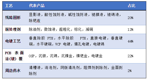 PCB制(zhi)造從(cong)開料(liao)到成(cheng)品包(bao)裝有(you)幹制(zhi)程、濕(shi)制程(cheng)幾十(shi)道工(gong)序,工(gong)藝流(liu)程長(zhang),控制(zhi)點繁(fan)瑣,影(ying)響品(pin)質因(yin)素較(jiao)多。 按(an)照PCB制(zhi)程,PCB化(hua)學👨🦰品(pin)一般(ban)可分(fen)爲線(xian)路形(xing)、前處(chu)理劑(ji)、電👩🍼鍍(du)工藝(yi)、PCB表面(mian)塗(鍍(du))覆及(ji)周邊(bian)藥水(shui),其中(zhong)電鍍(du)工藝(yi)占比(bi)最高(gao),達到(dao)44%,其次(ci)是👱🏼♂️PCB表(biao)明塗(tu)(鍍)覆(fu),占比(bi)達到(dao)22%。