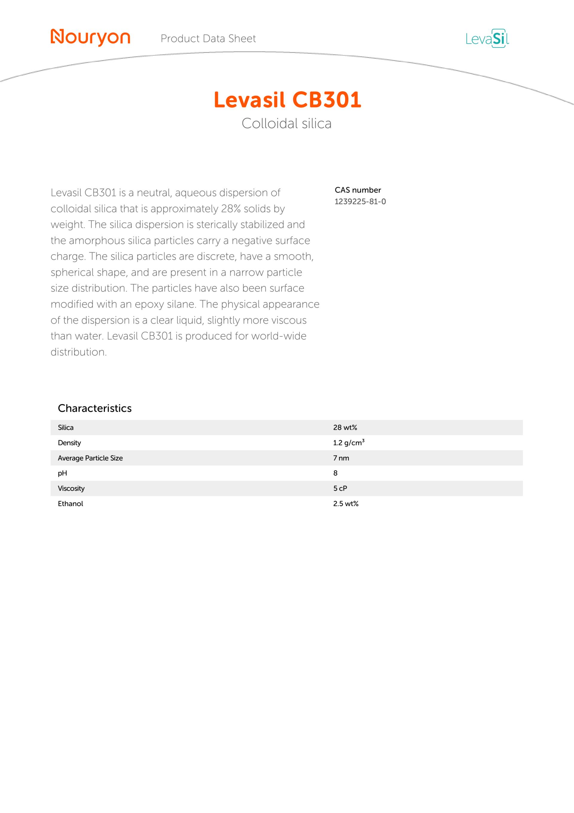 Levasil CB301 is a neutral, aqueous dispersion of colloidal silica that is approximately 28% solids by weight. The silica dispersion is sterically stabilized and the amorphous silica particles carry a negative surface charge. The silica particles are discrete, have a smooth, spherical shape, and are present in a narrow particle size distribution. The particles have also been surface modified with an epoxy silane. The physical appearance of the dispersion is a clear liquid, slightly more viscous than water. Levasil CB301 is produced for world-wide distribution.