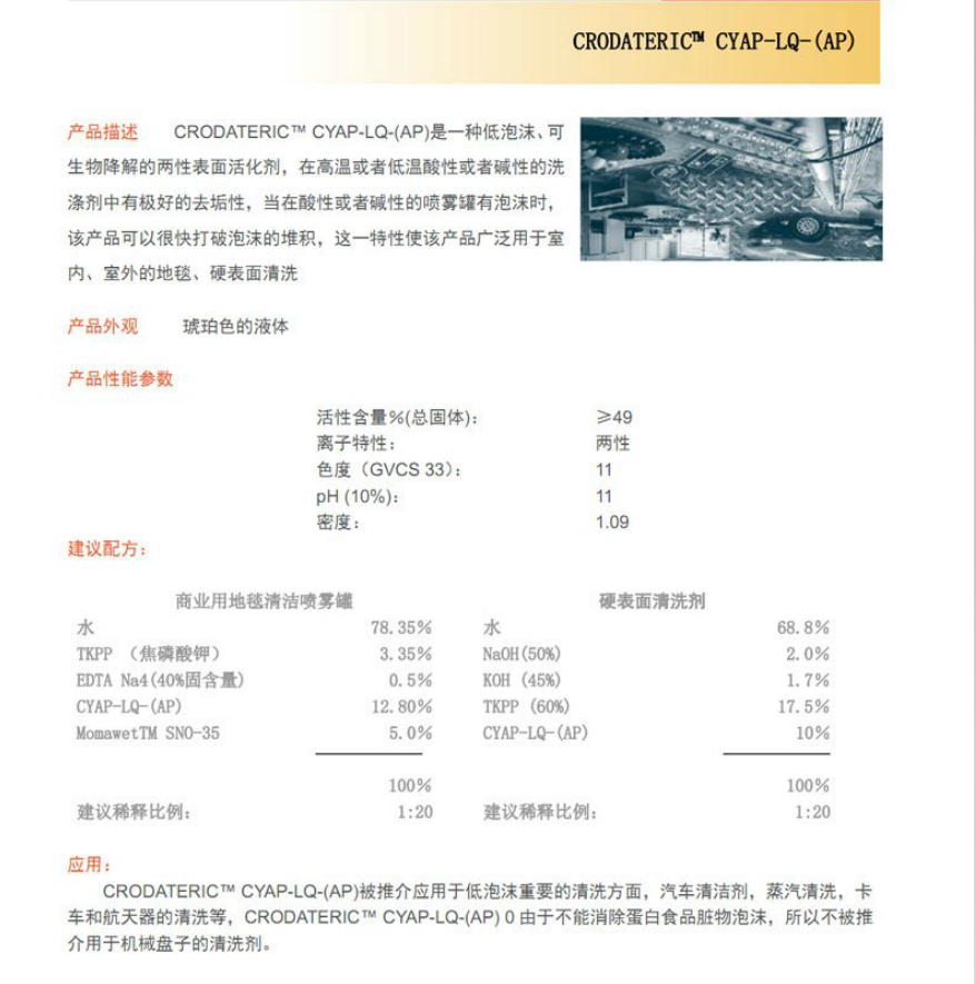 CRODATERIC CYAP-LQ-AP是一種(zhong)低泡沫(mo)、可生物(wu)降解的(de)兩性表(biao)面活性(xing)劑,在🚶🏾♀️➡️高(gao)溫或者(zhe)低溫酸(suan)性或者(zhe)堿性的(de)洗滌劑(ji)中有極(ji)好的去(qu)垢性,當(dang)在酸性(xing)或者堿(jian)性的噴(pen)霧罐有(you)泡沫時(shi)🏊🏾♀️,該産品(pin)可以很(hen)快打破(po)泡沫的(de)😜堆積,這(zhe)🙂↕️一特性(xing)使該産(chan)品廣泛(fan)用于室(shi)内、室外(wai)的地毯(tan)、硬表面(mian)清洗領(ling)域。