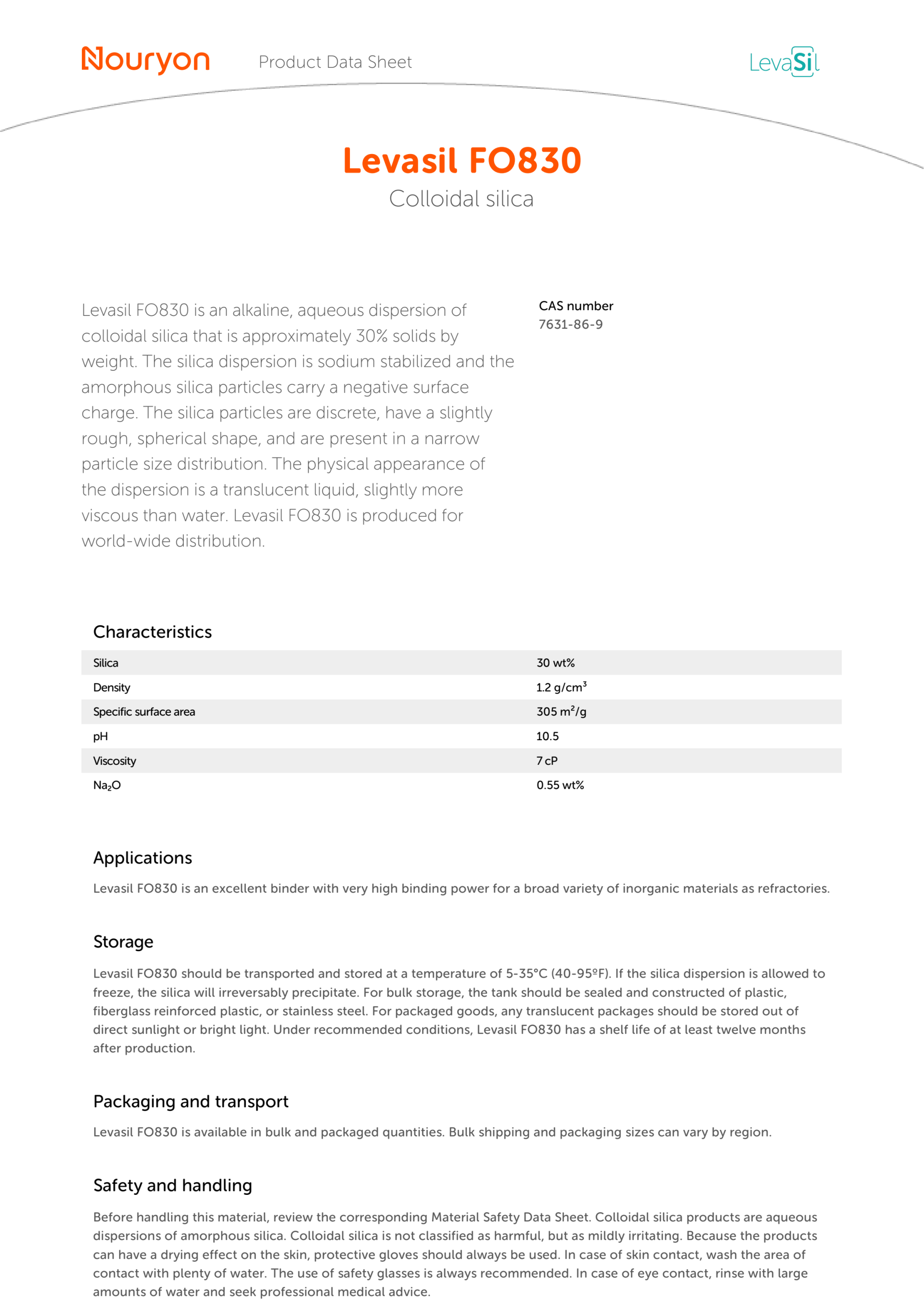 Levasil FO830 is an alkaline, aqueous dispersion of colloidal silica that is approximately 30% solids by weight. The silica dispersion is sodium stabilized and the amorphous silica particles carry a negative surface charge. The silica particles are discrete, have a slightly rough, spherical shape, and are present in a narrow particle size distribution. The physical appearance of the dispersion is a translucent liquid, slightly more viscous than water. Levasil FO830 is produced for world-wide distribution.
