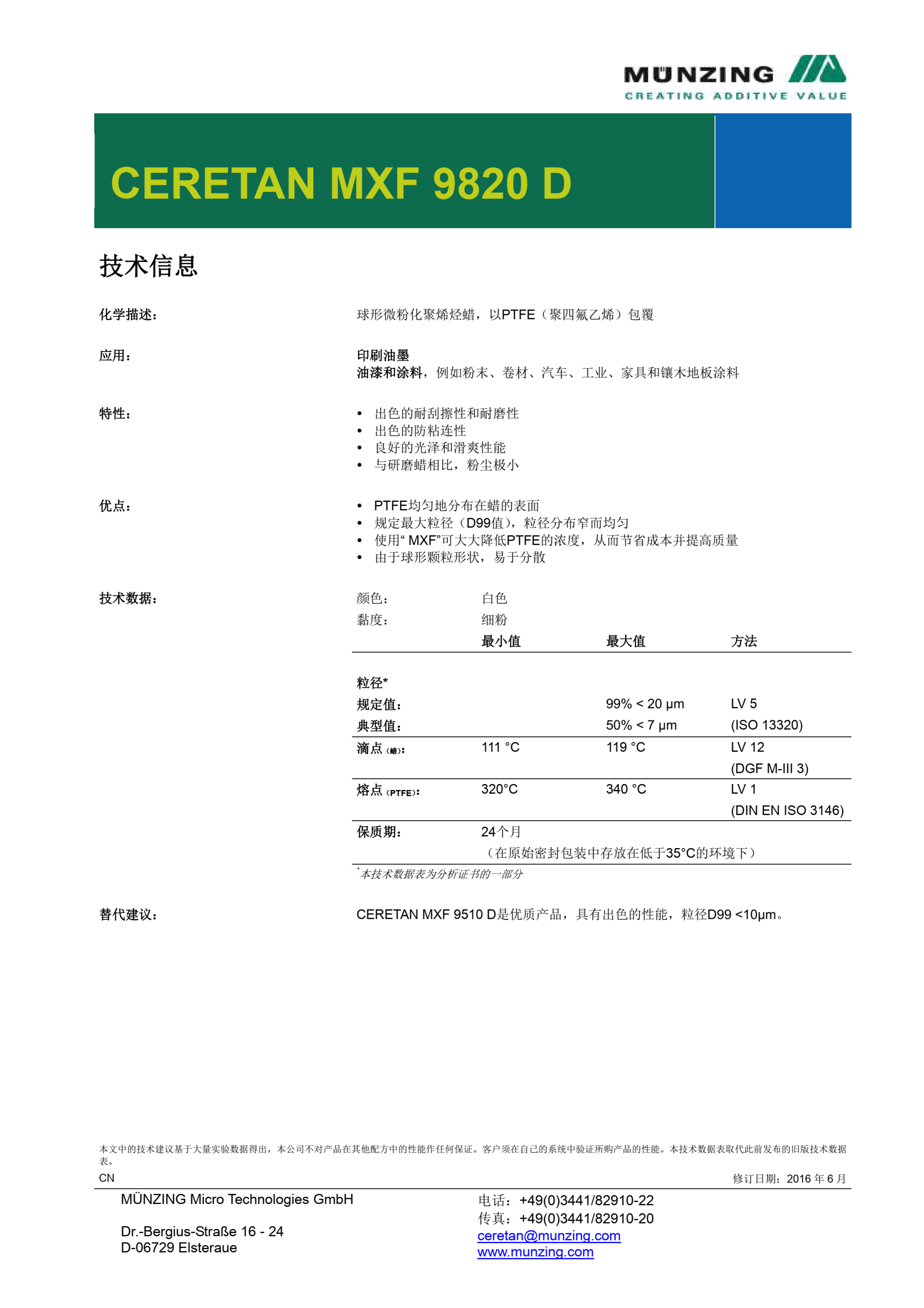 替代(dai)建議: CERETAN MXF 9510 D是優(you)質産品,具(ju)有出色的(de)性能,粒徑(jing)D99 <10μm。