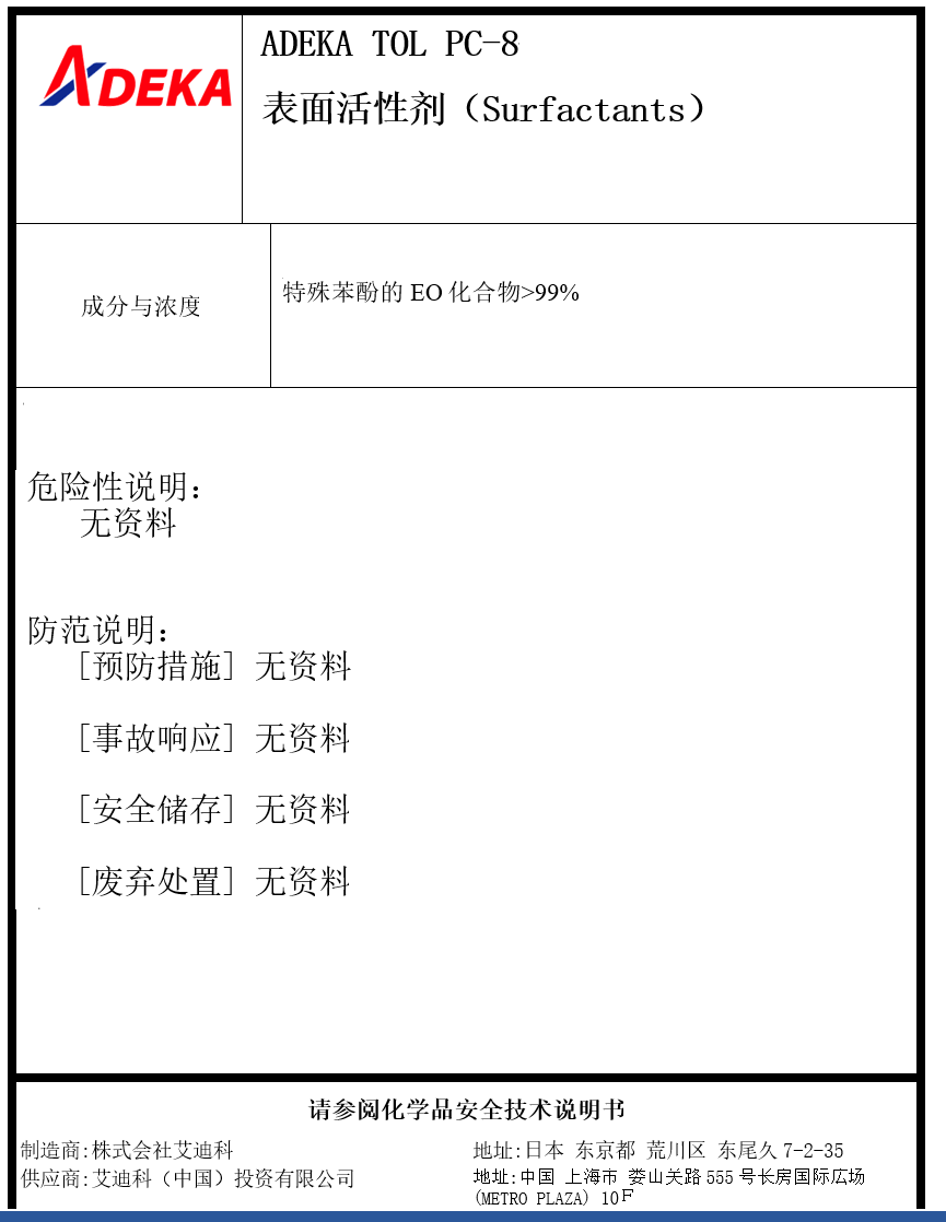 産品(pin)名稱:ADEKA TOL PC-8 文(wen)件編号(hao):00080-00-2