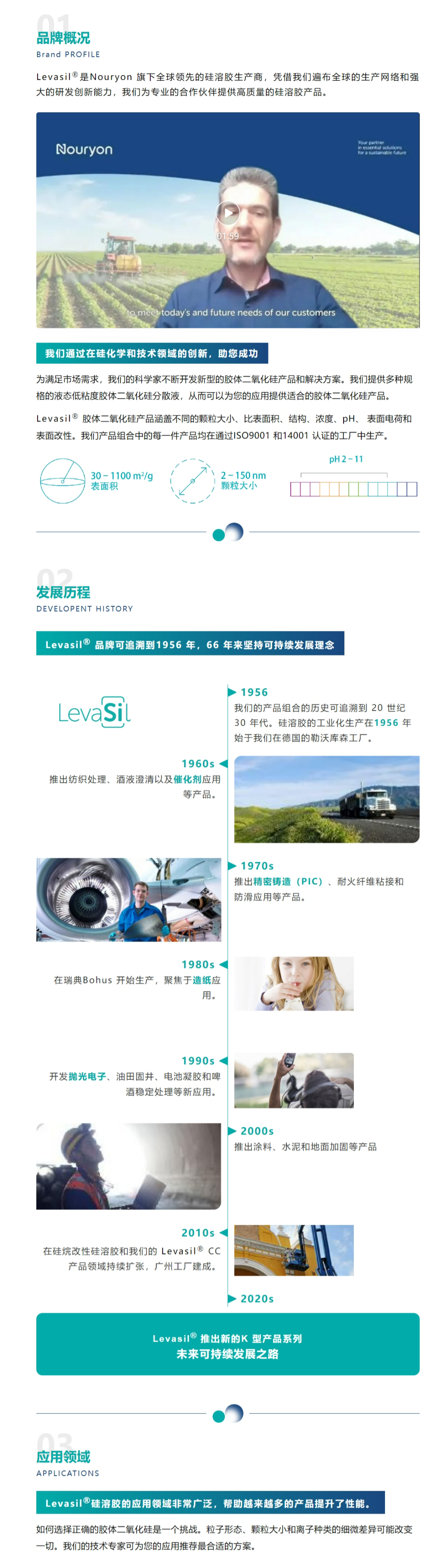 Levasil®是Nouryon(諾(nuo)力昂(ang)) 旗下(xia)全球(qiu)領先(xian)的矽(xi)溶膠(jiao)生産(chan)商,憑(ping)借我(wo)們遍(bian)布全(quan)球的(de)生産(chan)網絡(luo)和強(qiang)大的(de)研發(fa)創新(xin)能力(li),我們(men)爲專(zhuan)業的(de)合作(zuo)夥伴(ban)提供(gong)高質(zhi)量的(de)矽溶(rong)膠産(chan)品。Levasil® 矽(xi)溶膠(jiao)的工(gong)業化(hua)始于(yu)1956年我(wo)們在(zai)德國(guo)的勒(le)沃庫(ku)森工(gong)廠。66年(nian)來,我(wo)們的(de)産品(pin)已廣(guang)泛應(ying)用于(yu)造紙(zhi),塗料(liao),建築(zhu),電子(zi),催化(hua)劑,鑄(zhu)造,油(you)田服(fu)務,水(shui)處理(li)等領(ling)域,爲(wei)越來(lai)越多(duo)的産(chan)品提(ti)升性(xing)能,幫(bang)助世(shi)界各(ge)地的(de)客戶(hu)獲得(de)成功(gong)。