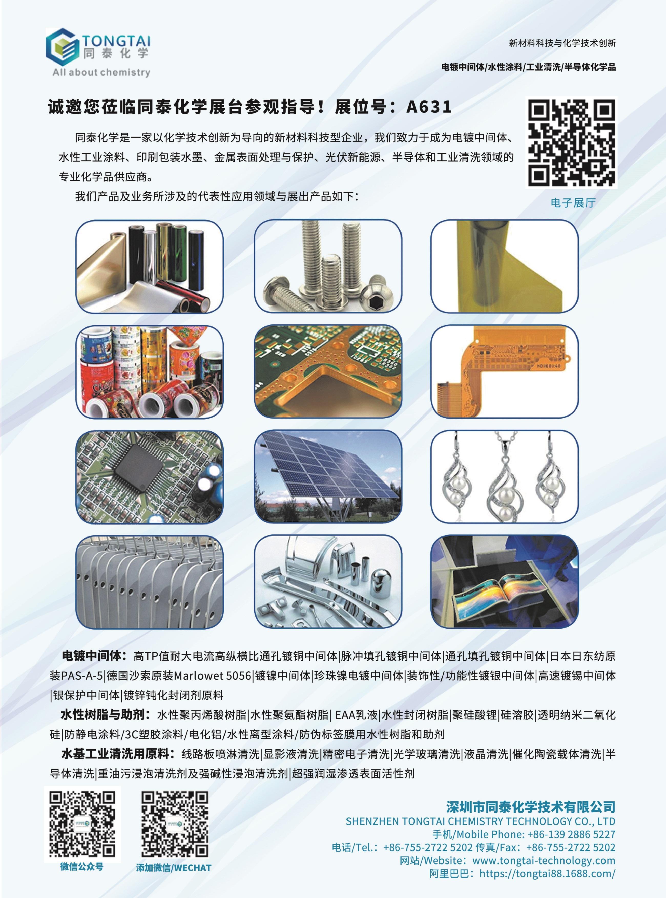 深(shen)圳市(shi)同泰(tai)化學(xue)技術(shu)有限(xian)公司(si)将參(can)加第(di)16屆國(guo)際(廣(guang)州)表(biao)面處(chu)理 電(dian)鍍 塗(tu)裝展(zhan)覽會(hui),即【廣(guang)州國(guo)際表(biao)面處(chu)理展(zhan)】。展會(hui)舉辦(ban)時間(jian)爲:2023年(nian)6月14-16日(ri),地點(dian):廣州(zhou)保利(li)世貿(mao)博覽(lan)館3号(hao)館(廣(guang)州市(shi)新港(gang)東路(lu)1000号)。我(wo)們誠(cheng)摯邀(yao)請您(nin)莅臨(lin)同泰(tai)化學(xue)展台(tai)參觀(guan)指導(dao)!展位(wei)号:A631。
